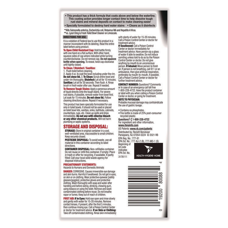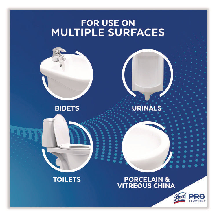 Clean, disinfect, and deodorize urinals and toilet bowls to give guests a clean bathroom experience. Meet staff and customer expectations around cleanliness with Lysol Toilet Bowl Cleaner. Optimize restroom cleaning time with a powerful formula that works on the toughest toilet stains in seconds. Remove hard water deposits with the thick 9.5% hydrochloric acid formula that adheres to stains for better cleaning and coats the bowl above and below the waterline. Lysol kills 99.9% of viruses and bacteria when used as directed. Elevate restroom experiences throughout facilities for customers and staff with a powerful cleaning formula that helps leave surfaces shiny. Will not harm plumbing or septic systems. Application: Toilet & Urinal Cleaner; Applicable Material: Bidets; Porcelain Surfaces; Toilets; Urinals; Chemical Compound: Hydrochloric Acid; Dirt Types: Grime; Mildew; Mineral Scale; Mold; Organic Matter; Rust; Soil; Stains.