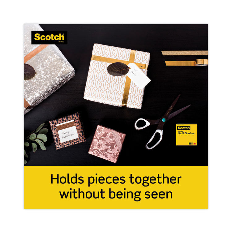 Put together sales presentations and reports the easy way with Scotch® Double-Sided Permanent Tape. Coated with permanent adhesive on both sides, it's a great no-mess alternative to glue for light-duty attaching and mounting tasks, making it ideal for presentations, reports, science projects, classroom presentations and art projects. Photo-safe for scrapbooking, photo mounting and other craft projects. Handy, compact dispenser for quick and easy, portable use. Liner-free and long-aging-won't dry out or yellow. Value Pack-Three rolls of tape each on handy, compact dispenser. Grade: Light-Duty; Core Size: 1"; Dispenser Included: Yes; Width: 0.5".