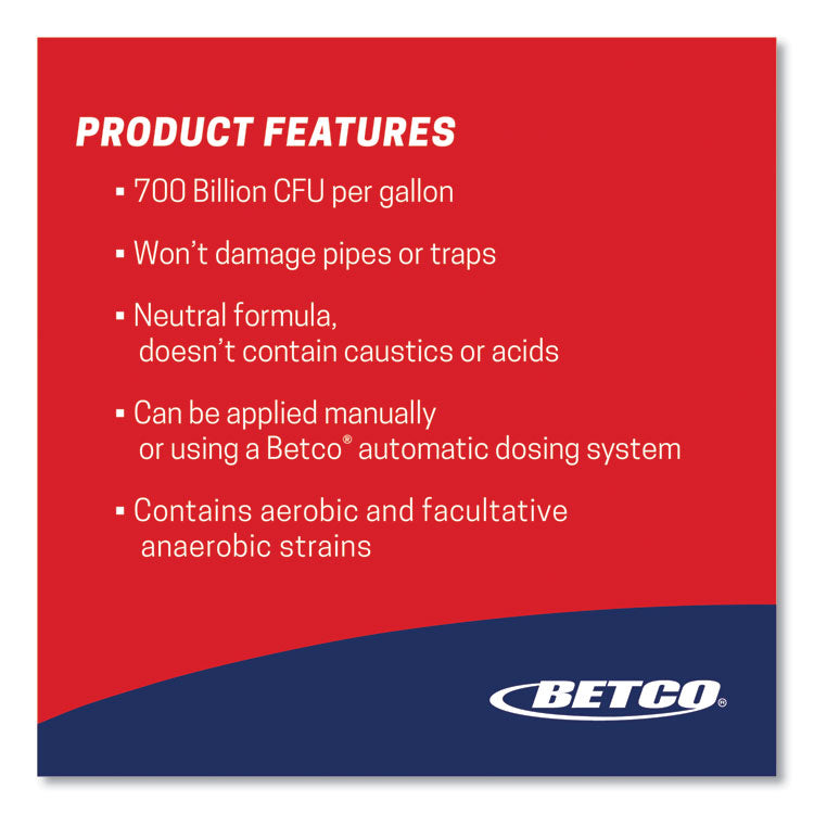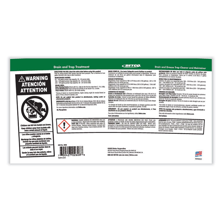 Drain and Trap Treatment contains a blend of probiotics that degrade grease and short and long-chain fatty acids that are the root cause in clogging drain lines and grease traps. The proprietary nutrient package greatly reduces the production of hydrogen sulfide odors and other foul odors that are commonly associated with anaerobic (no oxygen) environments. Application: Drains; Grease Traps; Applicable Material: Drains; Grease Traps; Chemical Compound: Sodium Dodecylbenzenesulfonate; Dirt Types: Fatty Acids; Grease.