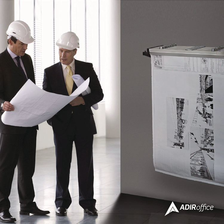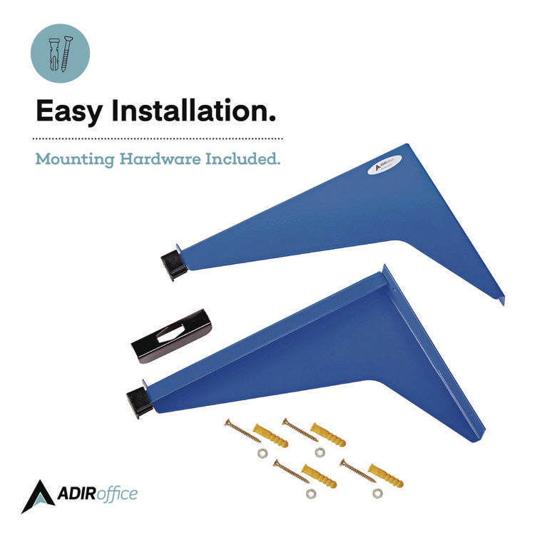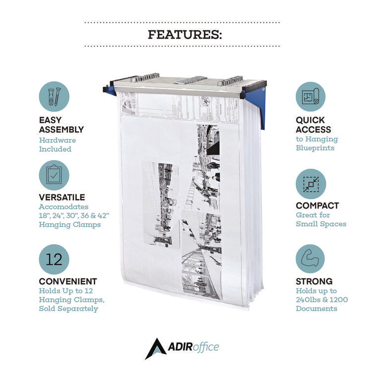 The AdirOffice Drop/Lift Wall Rack provides compact and convenient hanging storage in compact areas where space is limited. Just use hanging paper clamps to clip your blueprints, plan drawings, maps and other large files together, then put them in these handy, wall-mounted brackets to keep them organized and close at hand (clamps sold separately). Expertly constructed using solid steel, this wall rack will provide long-term durability and use for years to come. It boasts a 240-lb weight capacity and can hold up to 1,200 documents at once. It's furnished in a finish that will easily fit into and enhance any existing decor. This storage rack can fit any size paper clamps you choose depending on how far apart you install the brackets. Once the brackets are fixed, only one size clamp will fit. Mounting hardware is included for quick and easy installation on any wall. Due to the weight capacity, it's strongly recommended to attach the unit to wall studs or a solid surface. Once installed, clamps lift out and drop in for easy, convenient access to all of your stored documents, making your workplace efficient, organized and the best it can be. Color(s): Blue; Rack Style: Blueprint Literature Rack Display; Mounting: Wall; Document Size Accommodation: Assorted.