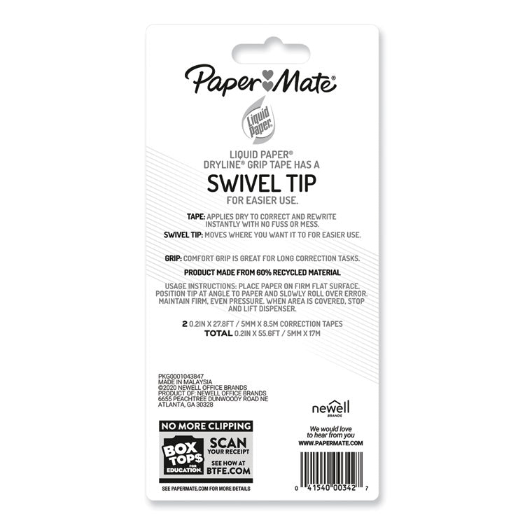 DryLine Grip Correction Tape, Recycled Dispenser, Green/White Applicator, 0.2" x 335", 2/Pack