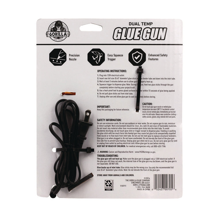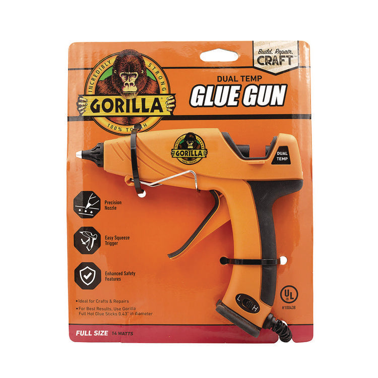 The Gorilla Dual Temp full-size glue gun is a great tool for crafts and home projects requiring more glue output and volume. The gun is lightweight, with a comfortable grip and a built-in stand making it easy to use. The easy-squeeze trigger and long insulated nozzle allow for precise application on any project. Heat Settings: Low; High.
