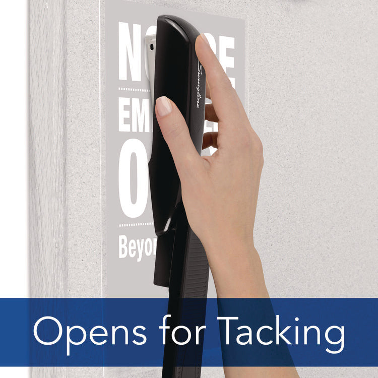 Long-term stapling performance you can rely on. Choose the Swingline® Durable Desk Stapler. Contoured for more comfortable use and greater aesthetic appeal, this stapler offers standard stapling, tacking and temporary pinning functionality. Simply use it as any desktop or handheld stapler to cinch papers and documents, open it flat to tack up notices and decorations or reverse the anvil after opening to create temporary pin staples. This stapler also features an antimicrobial-protection coating to repel bacteria and minimize the possibility of the stapler developing an odor over time, making it ideal for copy rooms and other shared spaces. All-metal base provides desktop and countertop stability while enhancing its overall durability. Uses S.F.® 4® Premium Staples. High Capacity Stapling: No; Flat Clinch Plate: No; Tacking: Yes; Staple Capacity: Full Strip (210 Staples).
