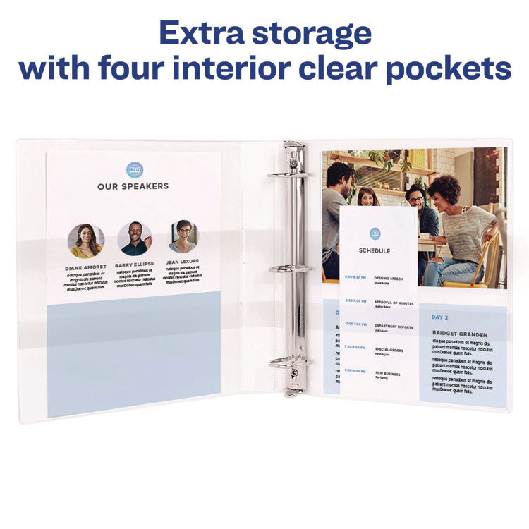 View Binder with EZD® rings was designed with a purpose—to hold more pages in less space. EZD® rings provide an increased capacity when compared to the same size slant or round rings. Tear-resistant DuraHinge® design is stronger and lasts longer. DuraEdge® feature makes the sides and top more pliable, providing greater split resistance. Deeply textured film offers a smoother finish and features a linen pattern for a high-quality look and feel. Durable construction is ideal for frequent referencing. Organize and secure papers within four interior pockets. Pages lie flat with back-mounted rings. Sturdy construction and clever design set a new standard in binder performance. Customize your binder with free templates and designs at Avery® Design & Print Online. Binder Type: Ring; Binder Style: View; Binder Size Capacity: 1.5"; Binder Sheet Capacity: 400.