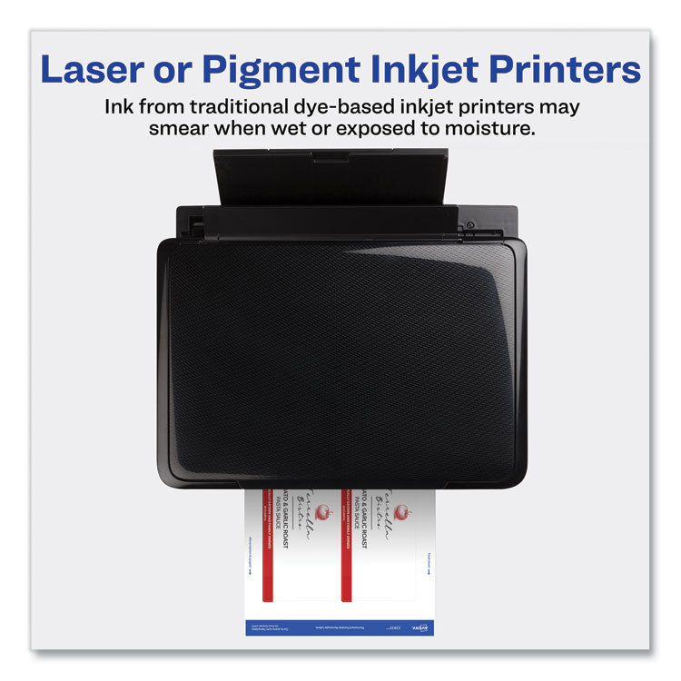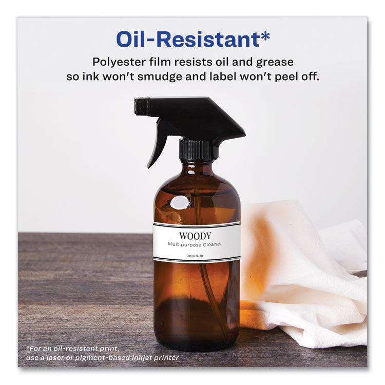 Showcase your brand with these versatile wraparound labels. Their water-resistant material and permanent adhesive make them perfect for branding water bottles. They're also ideal for use on products, packaging, marketing materials and more to make your brand or logo really stand out in the crowd. They stick to glass, plastic, paper and other materials, so you can put your mark on nearly any product. Our Print-to-the-Edge feature lets you add a full-color background and with free templates from Avery® Design & Print, you can easily customize the labels with your branding in mind. Brand your business with these unique labels. Print-to-the-Edge of the label for a custom look. Shape: Rectangular; Label Size - text: 3.25 x 7.75; Label Color(s): White; Color Family: White.