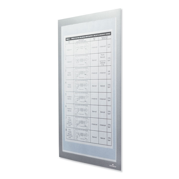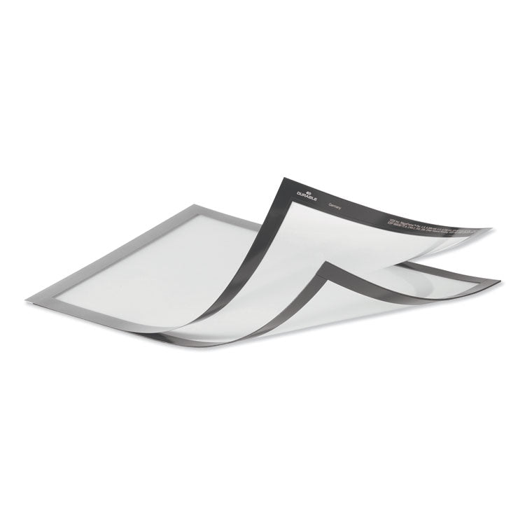 DURAFRAME® Magnetic PLUS Sign Holders from DURABLE® are the go-to solution for effortless professional signage display. Easily showcase important information on any smooth, magnetic metal surface with these professional frames, instantly grabbing attention and effectively conveying your message right where you need it. Keep your messaging up to date with the innovative flip-up magnetic frame. This unique design means you can update procedures, safety information, directional signage, promotions, or announcements without any hassle. Simply lift the frame, swap out your content, and secure it back in place with the magnetic closure. This keeps your signage fresh, relevant, and engaging for your employees and customers. When shut, the frame is fully enclosed, keeping signage clean and holding pages in place while protecting them from dust and spray in manufacturing facilities, warehouses, production halls, professional kitchens, restrooms, and anywhere with metal surfaces. With no bulky mounting hardware or unsightly tape, these sign holders have a clean and modern appearance. DURAFRAME's strong magnetic backing securely adheres to any smooth, magnetic metal surface, so you don't have to worry about slipping or falling. It can be repositioned easily, giving you the flexibility to adjust your signage as needed. Tailor your signage to fit your unique space perfectly by placing DURAFRAME in portrait or landscape orientation. Ideal for fast-paced and high-traffic environments such as production halls, professional kitchens, restrooms, manufacturing plants, warehouses, healthcare facilities, retail stores, hotels, and offices. DURAFRAME Magnetic Sign Holders offer practicality and versatility for your signage needs. Frame Color: Silver; Size: 9.5 x 12; Insert Size: 8.5 x 11; Material(s): PVC.