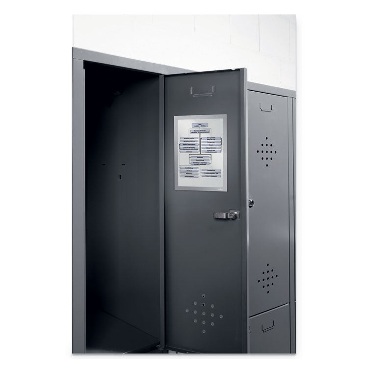 DURAFRAME® Magnetic Sign Holders from DURABLE® are the go-to solution for effortless professional signage display. Easily showcase important information on any smooth, magnetic metal surface with these professional frames, instantly grabbing attention and effectively conveying your message right where you need it. Keep your messaging up to date with the innovative flip-up magnetic frame. This unique design means you can update promotions, announcements, safety information, or directional signage without any hassle. Simply lift the frame, swap out your content, and secure it back in place on the metal surface. This keeps your signage fresh, relevant, and engaging for your employees and customers. With no bulky mounting hardware or unsightly tape, these sign holders have a clean and modern appearance. DURAFRAME's strong magnetic backing securely attaches to any smooth, magnetic metal surface, so you don't have to worry about the inserts dropping out. It can be repositioned easily, giving you the flexibility to adjust your signage as needed. Tailor your signage to fit your unique space perfectly by placing DURAFRAME in portrait or landscape orientation. Ideal for fast-paced and high-traffic environments such as retail stores, restaurants, hotels, offices, warehouses, healthcare facilities, and manufacturing plants, DURAFRAME Magnetic Sign Holders offer practicality and versatility for your signage needs. Frame Color: Silver; Size: 9.5 x 12; Insert Size: 8.5 x 11; Material(s): PVC.