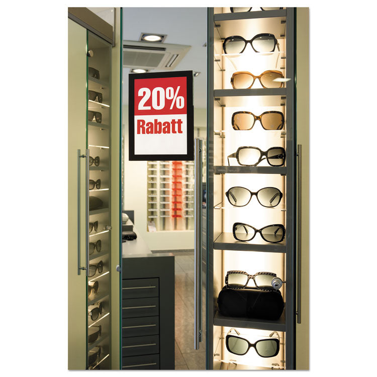 DURAFRAME® Self-Adhesive Sign Holders from DURABLE® are the go-to solution for effortless professional signage display. Easily showcase important information on windows, glass doors, or any smooth, solid surface with these dual-sided frames, instantly grabbing attention and effectively conveying your message right where you need it. The double-sided visibility displays two messages simultaneously for maximum impact. Perfect for storefronts, conference rooms, or any area where signage needs to be seen from inside and outside. Keep your messaging up to date with the innovative flip-up magnetic frame. This unique design means you can update promotions, announcements, safety information, or directional signage without any hassle. Simply lift the frame, swap out your content, and secure it back in place with the magnetic closure. This keeps your signage fresh, relevant, and engaging for your employees and customers. With no bulky mounting hardware or unsightly tape, these sign holders have a clean and modern appearance. DURAFRAME's self-adhesive backing securely adheres to any smooth, solid surface, and can be repositioned without leaving behind any residue, giving you the flexibility to adjust your signage as needed. Tailor your signage to fit your unique space perfectly by placing DURAFRAME in portrait or landscape orientation. Ideal for fast-paced and high-traffic environments such as retail stores, restaurants, hotels, offices, warehouses, healthcare facilities, and manufacturing plants, DURAFRAME Self-Adhesive Sign Holders offer practicality and versatility for your signage needs. Frame Color: Black; Size: 5.5 x 8.5; Insert Size: 5.5 x 8.5; Material(s): PVC.