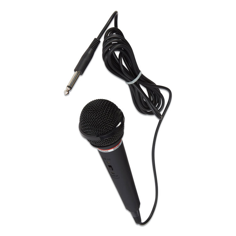 Black metallic dynamic unidirectional handheld microphone. Includes a 0.25 input jack and nine-foot cable for freedom of movement. Compatible with most Oklahoma Sound® sound lecterns and equipment. Cord Length: 9 ft; Batteries Required: No; Batteries Included: No; For Use With: Oklahoma Sound® Equipment.
