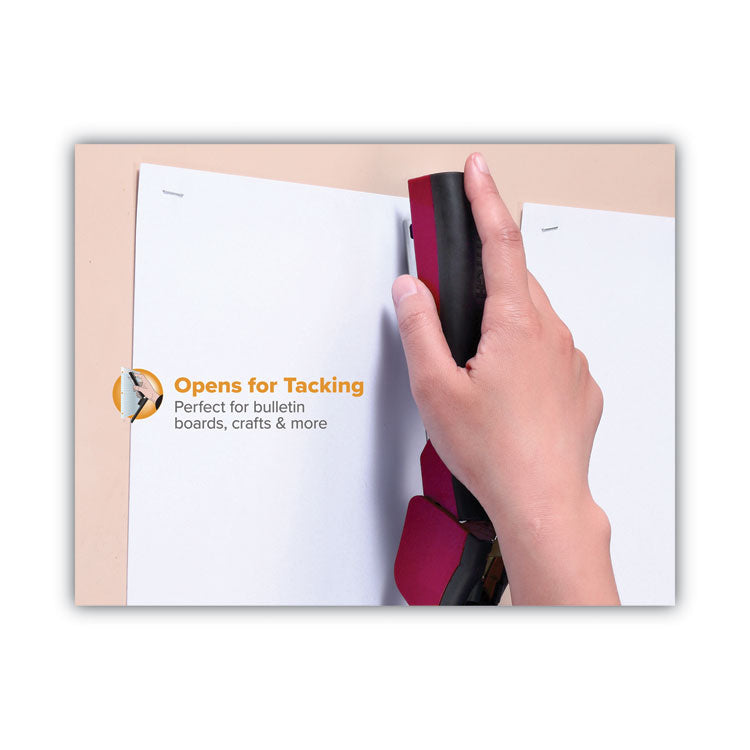 A gadget lover's dream. Antimicrobial product protection. Full-strip stapler amazingly features a built-in pencil sharpener, staple remover, and a StapleStore compartment (stores two extra staple strips). Efficient, yet lightweight, the curved silhouette rests in the palm of your hand while the soft rubber grip is perfect for frequent stapling. Opens 180° for bulletin board tacking. Stands vertically or horizontally. High Capacity Stapling: No; Flat Clinch Plate: No; Tacking: Yes; Staple Capacity: Full Strip (210 Staples).