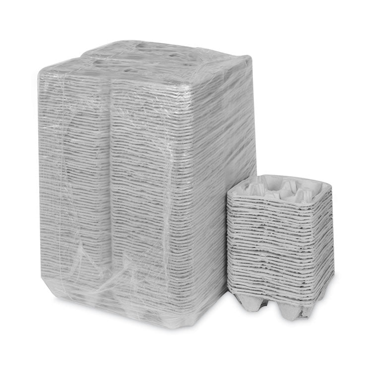 EarthChoice® fiber cup carriers are extremely durable and made with 100% recycled paper. Made with globally sourced materials. Ready to use with no set up required. Makes transporting on the go beverages simple and mess free. Perfect way to securely carry food and drinks in one handy tray! Handles a full range of cup sizes. Tray section is large enough for things like a hot dog or french fries keeping them secure with the elevated sides. Cup CarrierFour-cup carrier, 8 oz to 32 oz. Cup Size (Range): 8 oz to 32 oz; Cup Trays Capacity (text): Four Cups + Food Tray; Material(s): Fiber Blend; Color(s): Natural.