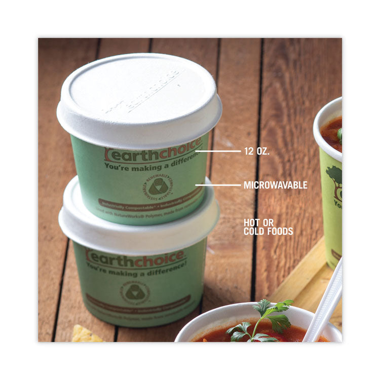 Renewable, versatile, and dependable. These containers are microwavable, which makes them great for a variety of hot or cold foods. Each soak-through-resistant cup is color-coded for easy size identification to help lessen the chance of operator mistakes and speed up food assembly. Cups will not melt or deform, which makes them ideal for delivery and takeout. Perfect for hot or cold foods such as soup, pasta salad, and mac and cheese. Made from 100% annually renewable resources and meet ASTM standard D6868 or D6400. Commercially compostable only. Facilities may not exist in your area. Not suitable for home composting. Medium Soup Container. Food Container Type: Base; Material(s): Paperboard; PLA; Material Type: Paper; Interior Volume Capacity: 12 oz.