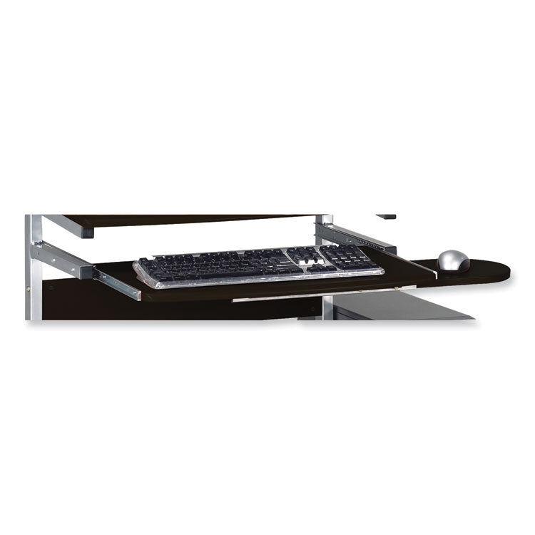 Cart enables easy portability and ample storage space. Slide-out keyboard tray with mouse platform for organization. CPU platform mounts left or right for user personalization. Mobile on five casters (two locking) for easy movement. Series Name: Safco® Eastwinds Series; Worksurface/Base Color: Anthracite; Color Family: Black; Worksurface Shape: Rectangular.
