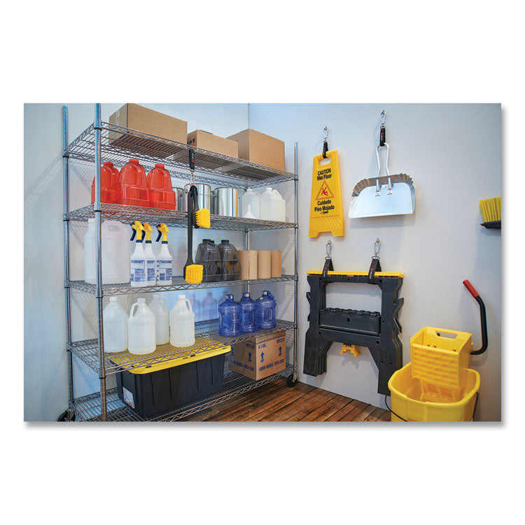 Keeps power cords, hoses and other trip hazards off the floor. Heavy-duty storage strap designed to wrap securely around larger items or bundle cords and hoses in order hang for storage and maximum organization. Suitable for indoor and outdoor use this reusable, adjustable strap with Zinc hook is weather resistant. Made from tough, durable and strong VELCRO Brand gripping hook and loop nylon material combined with the highest quality grade carabineer hook. Space saving. Large. Hook and Loop Fastener Type: Strap; Use Environment & Rating: Indoor/Outdoor Heavy-Duty; Color(s): Black/Silver; Weight Capacity: Up to 300 lbs.