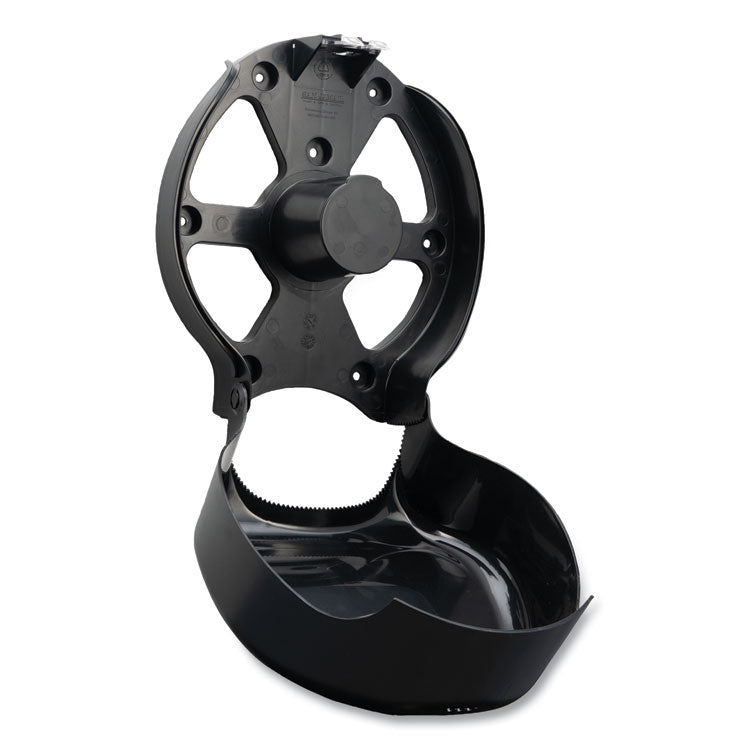 Made from recyclable and sustainable materials. Single JBT dispenser provides efficient and reliable tissue dispensing. Made of sustainable ABS resin with a bright green "eco" logo. The dispensers are shipped in 100% recycled boxes with instructions on recycled paper. They're sealed in biodegradable bags made from up to 20% plant-based polymer. For Roll Size: 9"; Roll Type: JBT; Dispenser Capacity (text): Holds One 9" Roll with 3.25" Core Diameter; Color(s): Black.