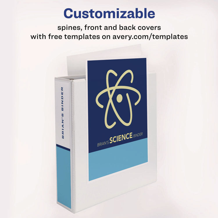 Perfect for light-use, this slim binder is a convenient and lightweight solution. Textured clear cover hides surface damage resulting from normal use. Put your personal stamp on the binder by designing a customized cover from Avery® Design & Print. Tuck important handouts, pamphlets and other loose or unpunched paperwork into the two interior pockets for quick access. Rings are either back-mounted for a clean spine and pages lie flat, or spine-mounted with concealed rivets - perfect for customizing front and back layers. It's the friend your papers never knew they were missing. Back-Mounted Rings-Textured clear cover; pages lie flat. Binder Type: Ring; Binder Style: View; Binder Size Capacity: 2"; Binder Sheet Capacity: 375.
