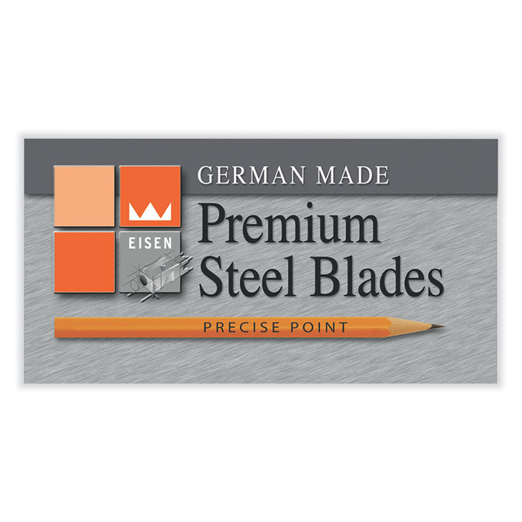 Keep your pencils on point with the Eisen manual pencil sharpener! This two-hole sharpener is compatible with most jumbo and standard woodcase pencils, and its kid-safe design makes it ideal for just about any classroom. Compact, handheld format is perfectly suited to nearly anyone's hands: children to adults, and the sharpener's generously sized canister keeps shavings from escaping until you're ready to empty it, minimizing the potential for messes. German steel blades remain sharp and effective, ensuring clean and easy pencil sharpening through the school year and beyond. Sharpener Type: Manual; Power Type: Manual; Batteries Required: No; Intended-Use Environment: Classroom; Home; Office.