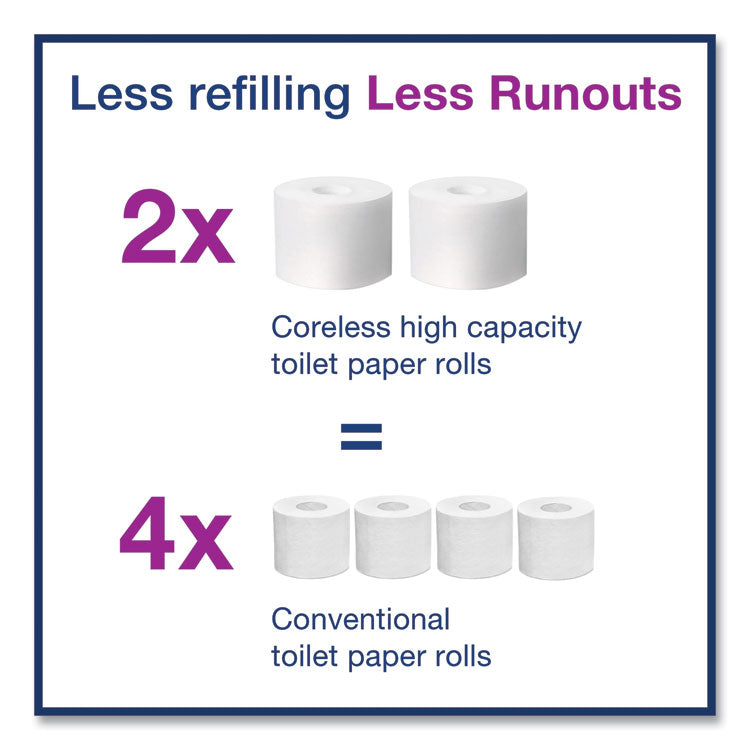 The Tork® Elevation® Coreless High Capacity Bath Tissue Dispenser is ideal for medium to high-traffic washrooms with high focus on guest satisfaction. Efficient dispenser ensures that toilet paper will always be available for guests by holding up to five times more paper than two conventional bath tissue rolls. Coreless rolls produce less trash to remove; Smart, stub-roll holder ensures full roll consumption to minimize waste. Compact horizontal dispenser saves space. For Roll Size: Up to 5.1" dia; Roll Type: Conventional; Dispenser Capacity (text): Hold Two Rolls; Color(s): Black.