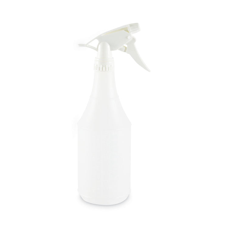 Clear bottle with embossed scale encourages user to properly proportion chemicals from larger containers and when mixed with water. Sleek, tapered neck bottle provides a more comfortable grip when used with a trigger sprayer. Easy-to-use, multi-purpose bottle for general-purpose cleaning in kitchens, bathrooms, offices, schools, and industrial settings. Securely holds cleaning solvents and water without spilling. Trigger sprayers sold separately. Material(s): HDPE; Color(s): Clear; Interior Volume Capacity: 24 oz; Quantity: 24/Carton.