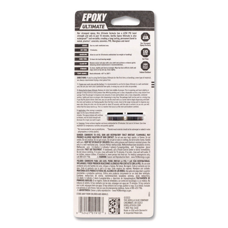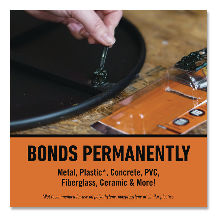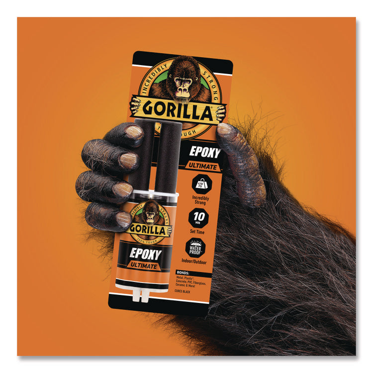Our strongest epoxy, this Ultimate formula has a 4,250 PSI bond strength and sets in just 10 minutes. Gorilla Epoxy Ultimate is also waterproof and versatile, creating a long-lasting, permanent bond to metal, plastics, concrete, ceramics, PVC, fiberglass and more. (Not recommended for use on polyethylene, polypropylene, or similar plastics. Bonded wood materials should not be submerged or soaked in water.). Adhesive Type: Epoxy; Product Packaging: Syringe; Washable/Removable: No; Color on Application: Black.