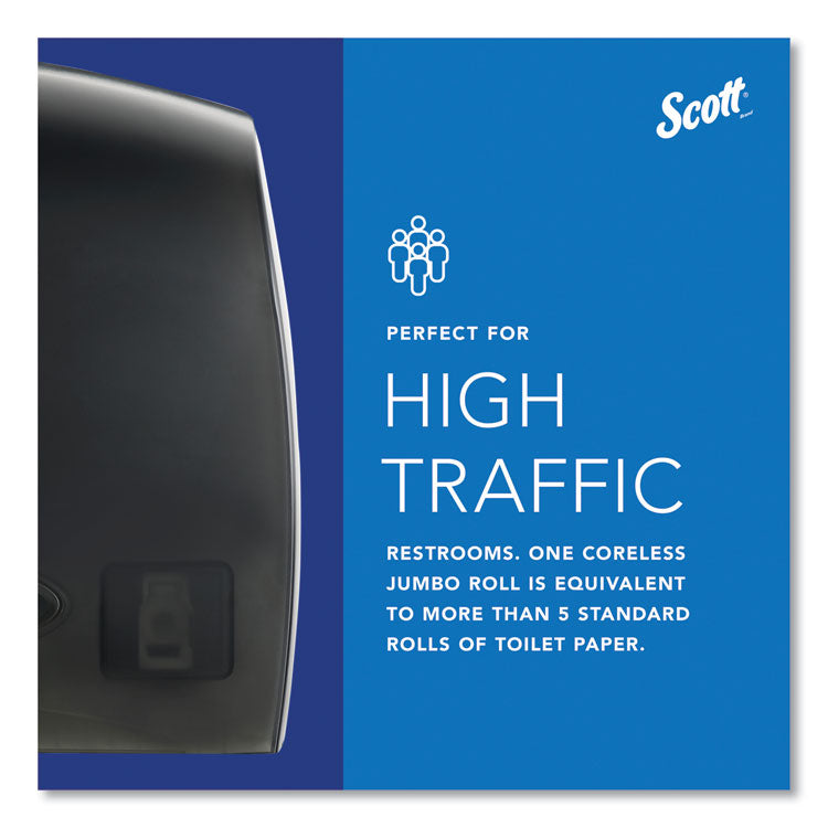 A positive restroom experience depends on the performance and efficiency of your dispenser. Scott Essential provides reliable balance of efficiency, performance and value. If you're responsible for a high-traffic restroom, you need a high-capacity bathroom tissue dispenser. The Scott Essential Coreless Toilet Paper Dispenser is a great solution. It holds more than the equivalent of six standard commercial rolls of bath tissue and is designed to minimize run-out, waste and maintenance time. The easy-to-load system features no door, no key and no core to throw away. It features a smaller footprint than many other standard JRT dispensers and accepts high-capacity coreless JRT rolls. After all, you have better things to do than worry about refilling toilet paper! As we look towards the future, Kimberly-Clark Professional is committed to providing a wide collection of essential products and services that help make your workplace exceptional. Kimberly-Clark Professional is devoted to innovative products and practices that serve your business's ever-changing needs and help empower your people. Our dedication to innovation has helped businesses confidently navigate change and empowered people at work for nearly 150 years and we are committed to do so for years to come. For Business—Packaged for commercial use. For Roll Size: 3.75"; Roll Type: Coreless; Dispenser Capacity (text): Holds One Coreless Roll; Color(s): Black.