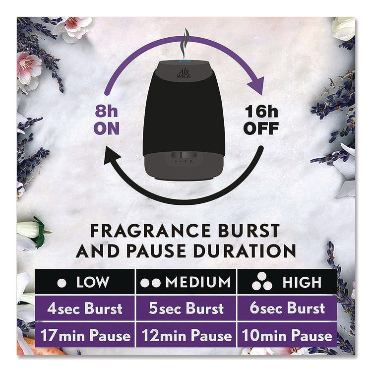 Contains natural essential oils. No water needed as oil diffuses into a mist through microscopic holes in the vibrating plate. Each refill lasts up to 45 days on the lowest intensity setting. For use in Air Wick Essential Mist Diffusers. Three intensity settings for ultimate fragrance control. Scent: Fresh Waters; Physical Form: Liquid; Application: Automatic Odor Control; Volume Capacity: 0.67 oz.