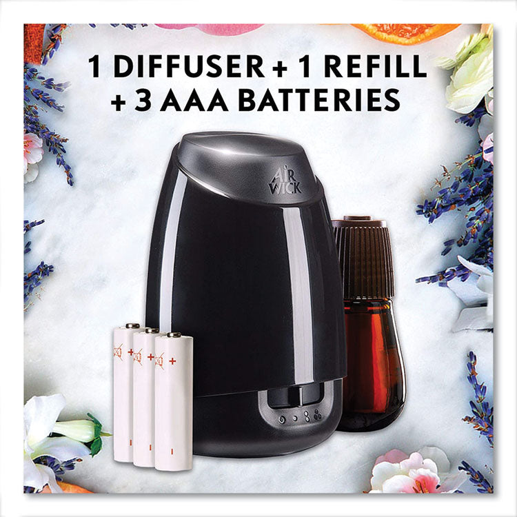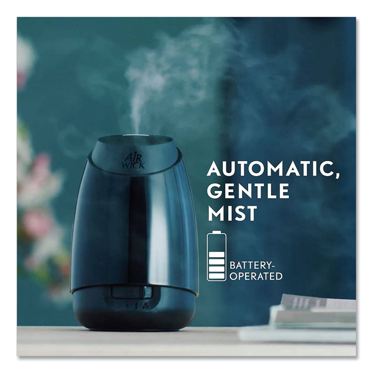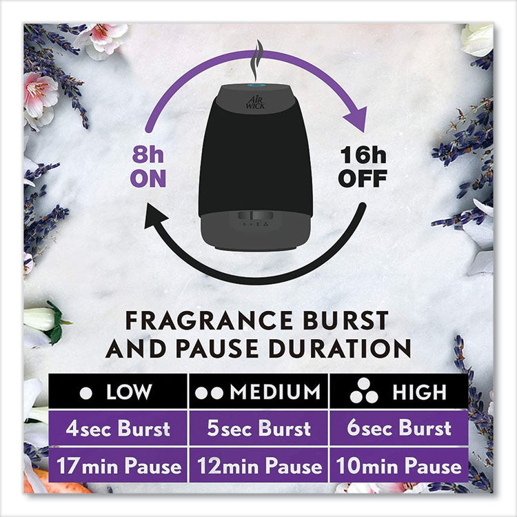 Once started, the device automatically shuts off after 8 hours, restarting at the same time the next day - 8 hours on, 16 hours off. No water needed as it contains natural essential oils that diffuse into a mist through microscopic holes in the vibrating plate. Battery operated for placement anywhere. Each refill lasts up to 45 days on the lowest intensity setting. Batteries included. Scent: Lavender & Almond Blossom; Physical Form: Liquid; Application: Automatic Odor Control; Volume Capacity: 0.67 oz.