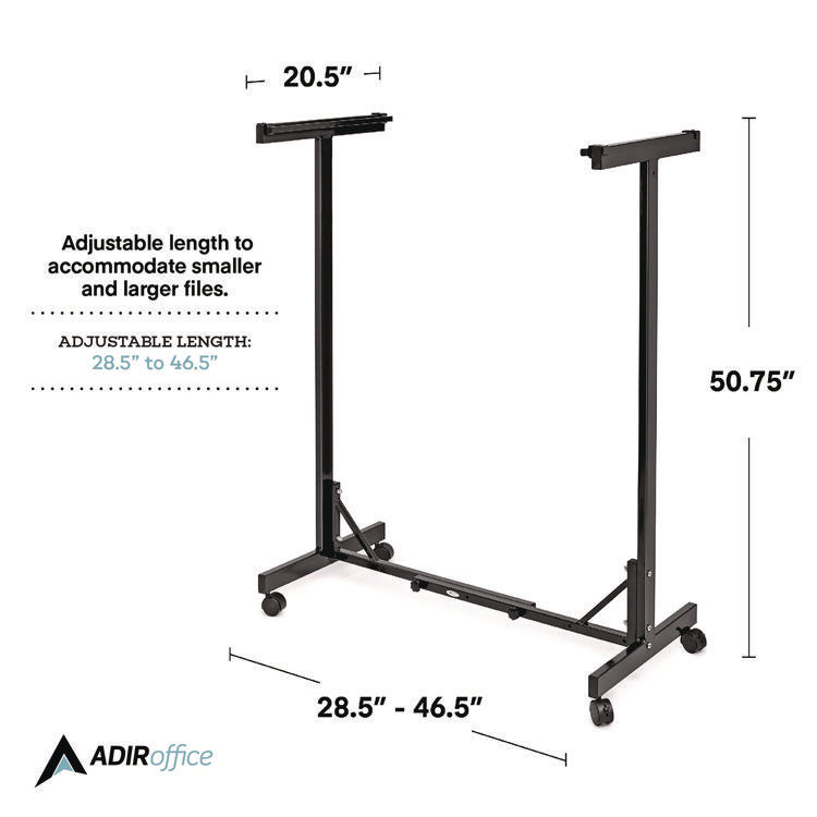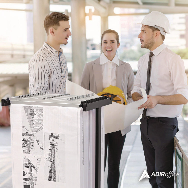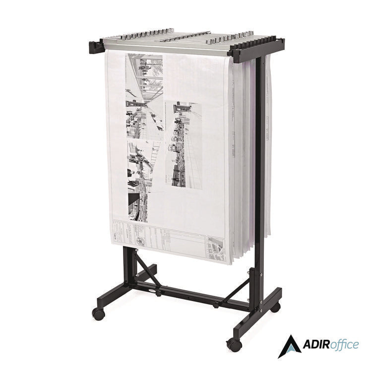Stay organized and efficient in the office with the AdirOffice Expandable Mobile Plan Center for Blueprints. For quick access, hanging blueprint storage, just clamp your files into hanging paper clamps and drop them into the top bracket. Designed for blueprints, plan drawings, maps and other large-format documents. Made of heavy-gauge steel with a 360 lb weight capacity, this rack can hold up to 1,800 documents at once. With its durable construction and powder-coated finish, you can be certain that it will provide long-lasting strength and use for years to come. For added convenience, this blueprint rack is adjustable to accommodate your largest files. The bracket accommodates 18 clamps and can be adjusted to fit paper clamps that are 24", 30", 36" or 42". Only one size of hanging clamps can be placed into this mobile blueprint stand at any one time. An ingenious solution to the difficulties of moving documents, this mobile plan center works equally well in harsh environments, such as construction sites, and soft settings, such as modern offices. Four swivel casters, two of which brake for control of movement and to keep the rack stable when you get to your destination, let you move this much weight with ease. Color(s): Black; Rack Style: Blueprint Literature Rack Display; Mounting: Freestanding; Document Size Accommodation: Assorted.