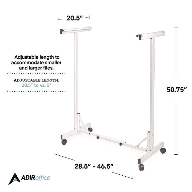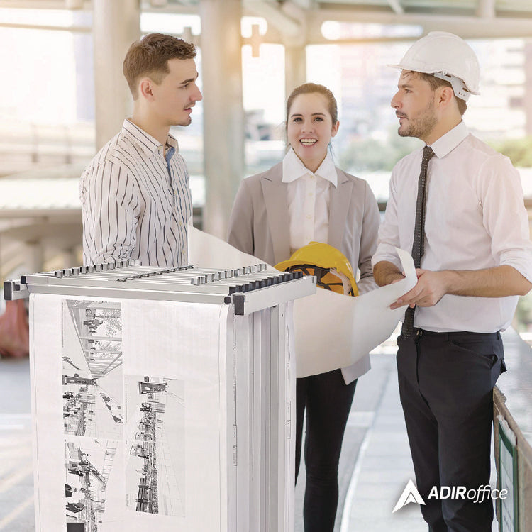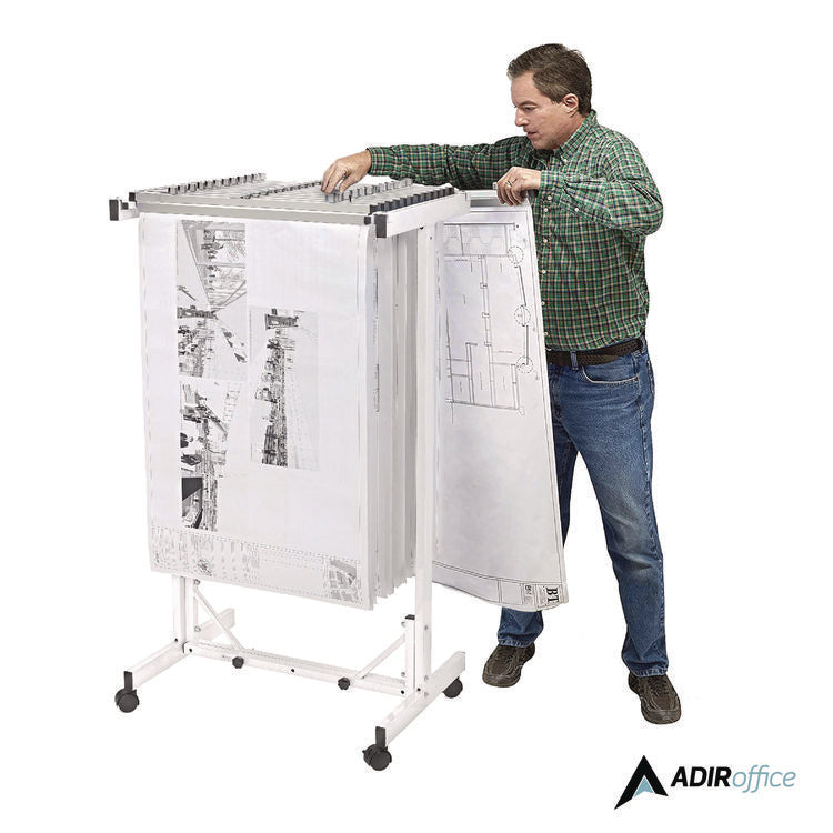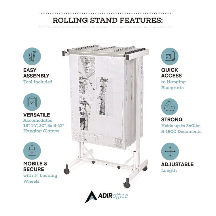 Stay organized and efficient in the office with the AdirOffice Expandable Mobile Plan Center for Blueprints. For quick access, hanging blueprint storage, just clamp your files into hanging paper clamps and drop them into the top bracket. Designed for blueprints, plan drawings, maps and other large-format documents. Made of heavy-gauge steel with a 360 lb weight capacity, this rack can hold up to 1,800 documents at once. With its durable construction and powder-coated finish, you can be certain that it will provide long-lasting strength and use for years to come. For added convenience, this blueprint rack is adjustable to accommodate your largest files. The bracket accommodates 18 clamps and can be adjusted to fit paper clamps that are 24", 30", 36" or 42". Only one size of hanging clamps can be placed into this mobile blueprint stand at any one time. An ingenious solution to the difficulties of moving documents, this mobile plan center works equally well in harsh environments, such as construction sites, and soft settings, such as modern offices. Four swivel casters, two of which brake for control of movement and to keep the rack stable when you get to your destination, let you move this much weight with ease. Color(s): White; Rack Style: Blueprint Literature Rack Display; Mounting: Freestanding; Document Size Accommodation: Assorted.