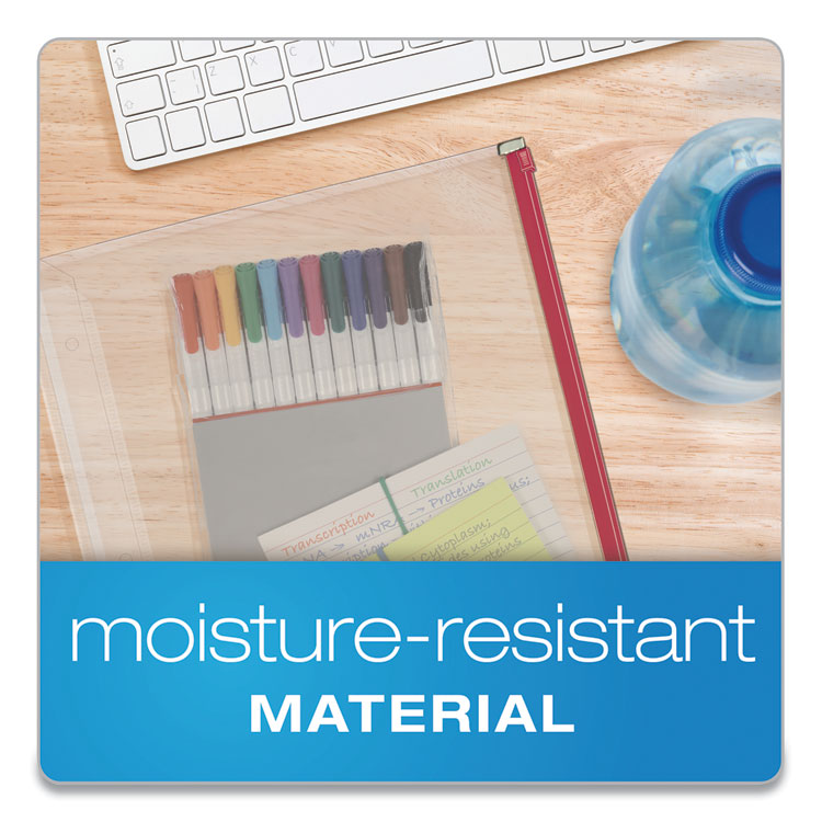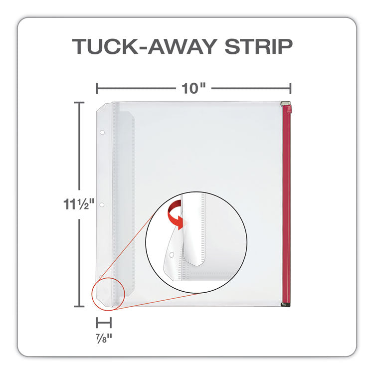 Cardinal® Poly Zippered Binder Pockets store and protect critical documents. These side-loading three-hole-punched inserts expand 1/2" to hold up to 100 sheets. Colorful slide zippers keep it all contained. Clear poly is non-stick and archival safe for documents and photos. Keeps critical papers—from passports to term papers—safe from accidents and spills. With zippers in blue, black, red, purple and green for color-coded organization. Color(s): Assorted; Height: 11"; Width: 8.5"; Color Assortment: Black; Blue; Red; Purple; Green.