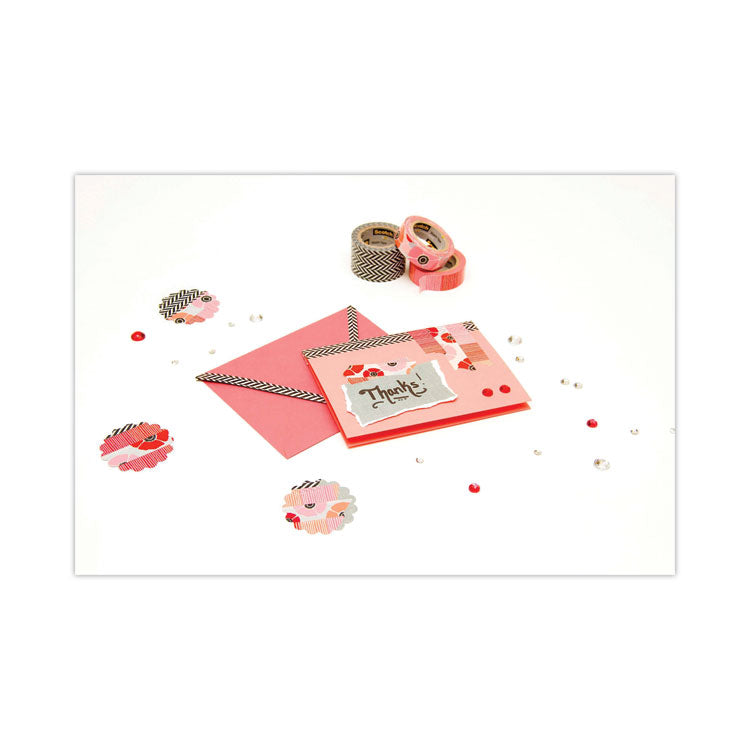 Scotch® Expressions Washi Tape comes in a variety of colors, so you can decorate and personalize your projects. Add a unique touch to home decor or a fresh accent to a simple vase. There's no end to the creative ways you can use Scotch® Expressions Washi Tape! It's initially repositionable on most surfaces, tears cleanly and accepts marks from pens, pencils and markers. Grade: Light-Duty; Core Size: 1.25"; Dispenser Included: No; Adhesive Material: Acrylic.