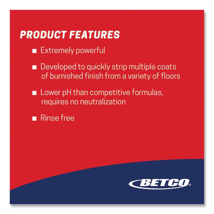 This high-power, high-speed floor stripper was developed to penetrate and remove multiple coats of burnished floor finish with a minimum amount of labor. Utilizing the latest in technology, this powerful professional stripper unlocks the chemical bonds of acrylic- and urethane-fortified floor finishes releasing them from the floor surface and is suitable for use on most surfaces. Recommended for removing multiple coats of water-based acrylic and urethane-fortified floor finishes from all types of resilient tile and hard surfaces. Not recommended for use on linoleum or sheet vinyl floors. Rinse-free formula has a lower pH than competitive formulas and requires no neutralization or rinsing. Application: Floor Stripper; Applicable Material: Hard Surfaces; Resilient Flooring; Chemical Compound: Butoxyethanol; Dirt Types: Floor Finish.