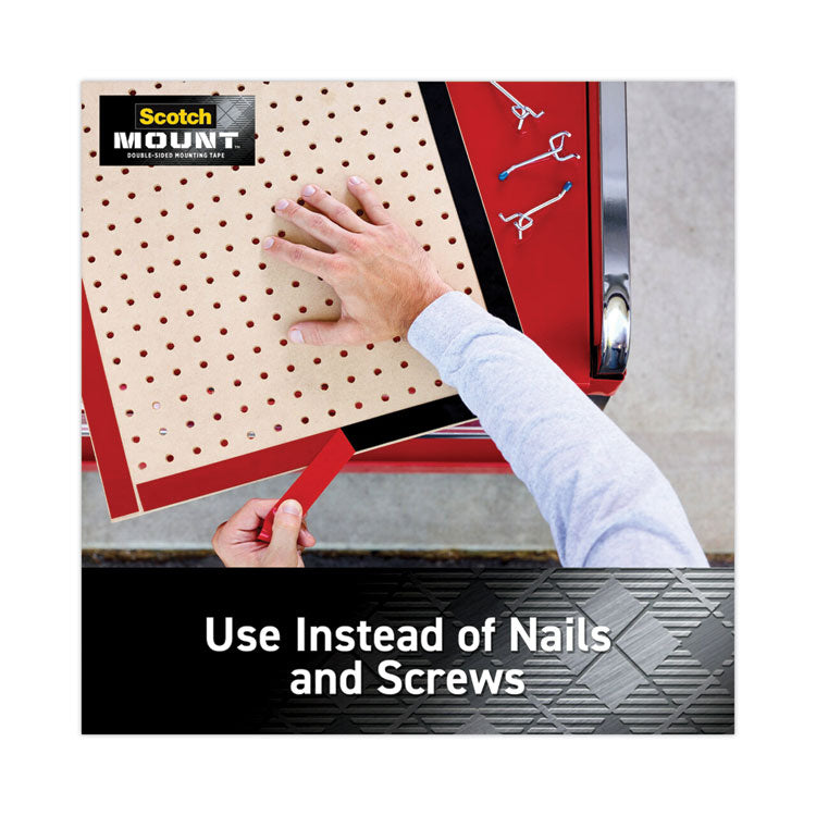 Equipped with our powerful permanent adhesive, this double-sided tape defies gravity, holding an item up to 30 pounds. It's weather resistant for a long-lasting bond, indoors and outdoors. So, whether you're mounting shelves in your new apartment, or adding wall organization to the garage, Scotch-Mount™ Extreme Double-Sided Mounting Tape does the job quickly, easily and without the hassle of tools. Holds: Up to 30 lbs; Permanent/Removable/Repositionable: Permanent; Mounting Application: Adhesive; Width: 1".