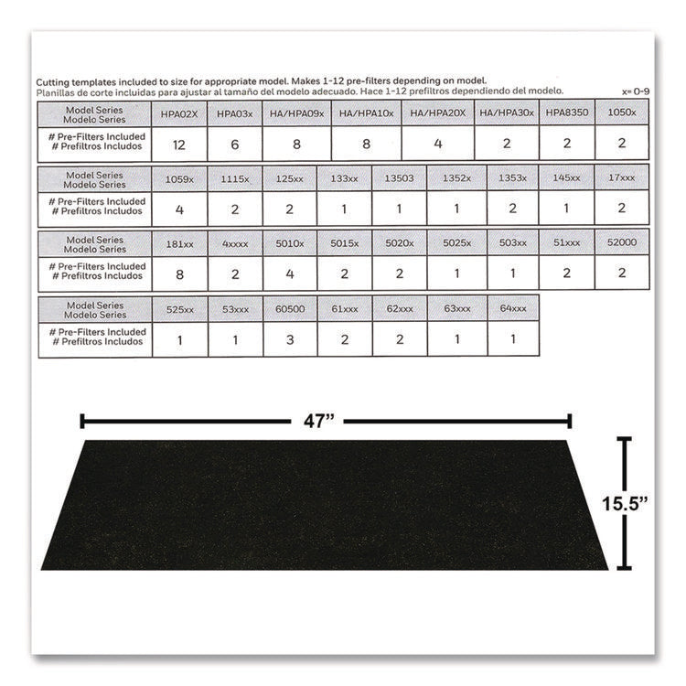 Honeywell Pre-Filters effectively deodorize the air and trap larger particles such as dust, lint, fibers and pet fur. Enjoy the many comforts associated with surrounding yourself with a pristine breathing experience all year round with Honeywell Pre-Filters. Using Honeywell Household Odor and Gas Reducing Universal Pre-filters is also an excellent way to boost and maximize the performance of a HEPA filter. Formulated with activated carbon and zeolite, Honeywell Pre Filter A+ provides extra odor reduction while reducing VOCs. It's a combination that makes these air purifier pre filters excel in reducing household odors such as those from pets, cooking and smoke. Premium odor filters can also be extremely effective in capturing particular household gases such as ammonia and the gases from cleaning products, paint and furnishings. Air Purifier Filter Type: Carbon Pre-Filter; Filtration For: Dust; Fibers; Fur; Lint; Odors; Pet Hair; VOCs; Air Cleaner Compatibility: Honeywell Series Models 10500; 10590; 11150; 12500; 13300; 13503; 13520; 13530; 14500; 17000; 18100; 40000; 50100; 50150; 50200; 50250; 50255; 50300; 60500; 61000; 62000; 63000; 64000; HPA020; HPA030; HA090; HPA080; HPA090; HA100; HPA100; HPA180; HPA200; HPA250; HA300; HPA300; HPA3100 to HPA3300; HPA5100 to HPA5300; Width: 47".