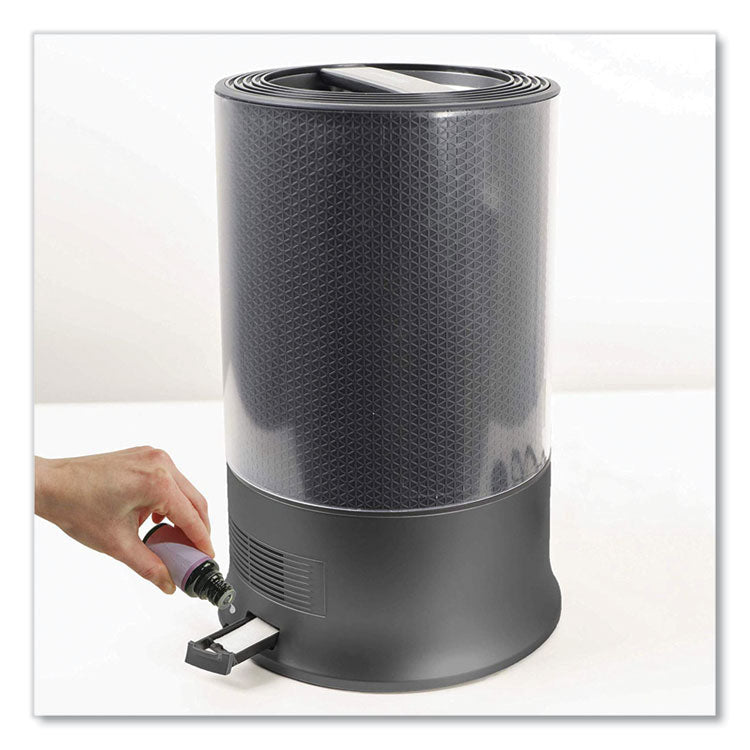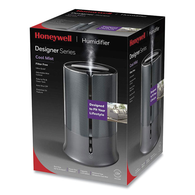 The Honeywell Designer Series Cool Mist Humidifier utilizes a filter free and ultra-quiet approach to releasing ultrasonic cool mist into the surrounding air. Adjustable mist controls will allow owners to manually select their preferred mist output settings via a textured metal control wheel. The illuminated water window includes three settings (bright/dim/off). These lighting features and a wide tank opening allow for a seamless cleaning and refilling process. Tank Capacity: 1.25 gal; Maximum Run Time: 24 h; Color(s): Black; Output Per Day: 1.25 gal.