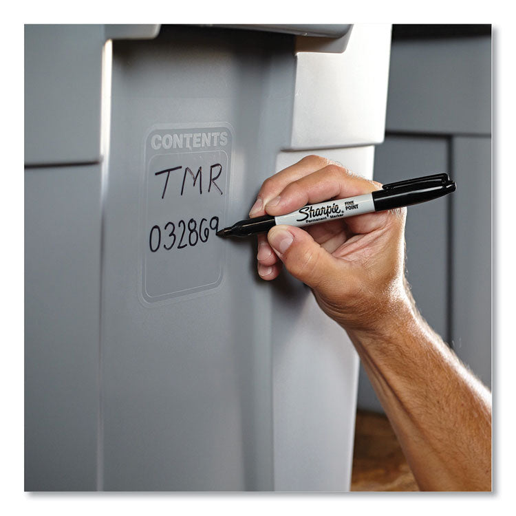 Bold to the max and permanent to the core, Sharpie® Fine Tip Permanent Markers inspire you to transform ordinary surfaces into passionately creative statements. Made to write practically everywhere, vivid Sharpie® markers eliminate dull and boring. The original permanent marker, Sharpie® has the iconic ink that dries quickly and resists both water and fading. While pale imitations wither away, Sharpie® markers make creations that endure. Featuring a bold, fine point bullet tip built for jaw-dropping marks, these permanent markers ignite courageous self-expression. Canister-Markers come in a reusable plastic canister. Marker Ink Type: Permanent; Marker Tip Type: Bullet; Marker Tip Size (text): Fine; Marker Color(s): Black.