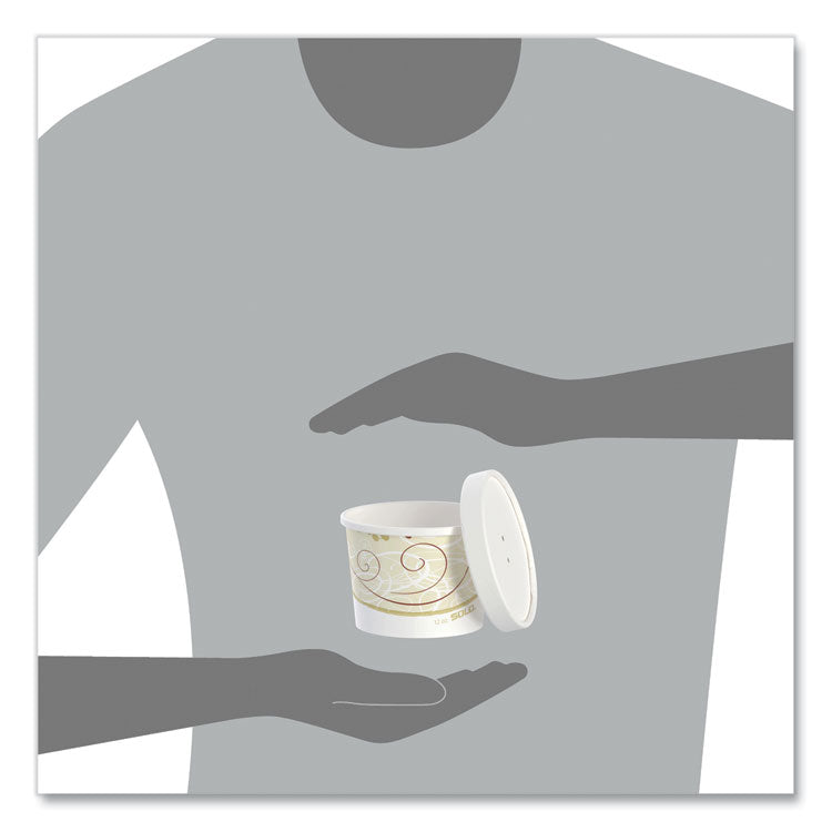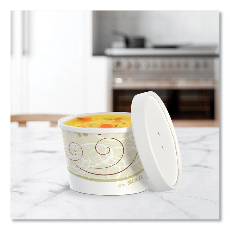 Double-sided poly coating locks in flavor and freshness, making these containers ideal for take-out and delivery foodservice. Snug-fitting vented paper lids accommodate both hot and cold menu items. Reinforced base and rim ensure strong, leak-proof performance. Material(s): DSP - Double Sided Poly Paper; Material Type: Paper; Interior Volume Capacity: 12 oz; Color(s): Symphony.