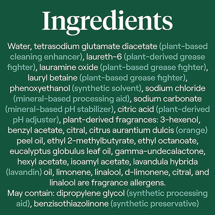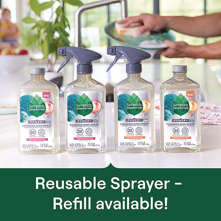 Wouldn't it be great if you could get clean dishes faster, while also caring for your family? Spoiler alert, you can! A quicker, cleaner way to do dishes, our formula leaves nothing behind but clean dishes. And with 3x grease fighters, our thick foaming action breaks down the toughest messes, so you don't have to. Just spray, wipe and rinse. Less scrubbing. Less work. Now that's clean! Even better, no pre-soak means both time and water saved for a dish clean that does right by your family today and nurtures the health of the next seven generations to come. Application: Hand Dishwashing; Applicable Material: Ceramic; Glass; Metal; Plastic; Stainless Steel; Chemical Compound: Water; Tetrasodium Glutamate Diacetate; Laureth-6; Lauramine Oxide; Lauryl Betaine; Phenoxyethanol; Sodium Carbonate; Citric Acid; Fragance; Dirt Types: Beef Fat; Burnt-On Cheese; Coffee; Fat; Olive Oil.