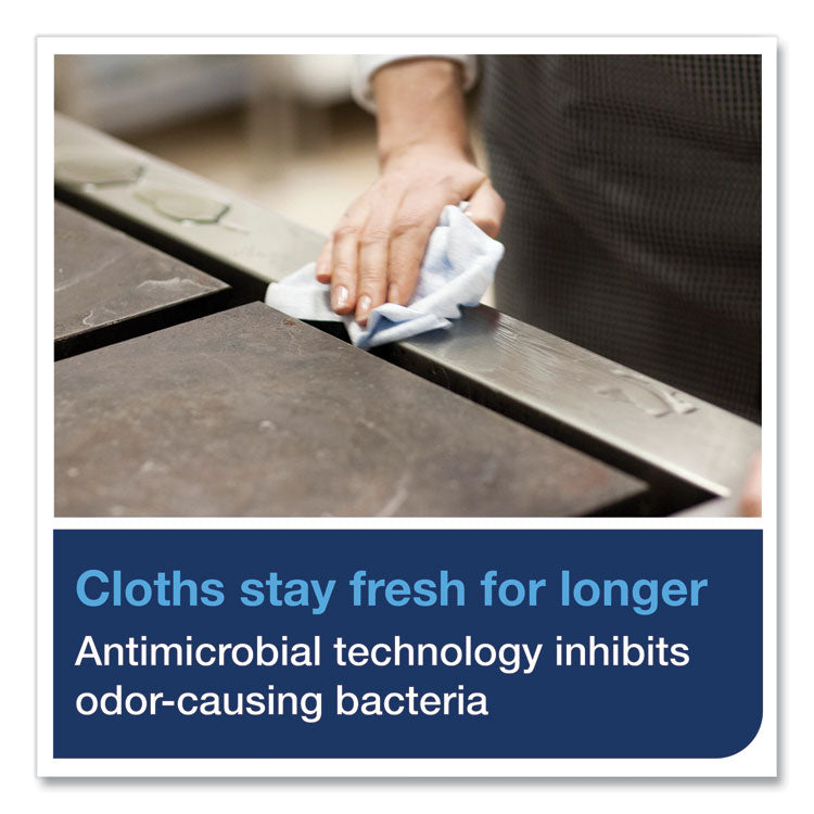 The Tork Foodservice Cleaning Towel is an excellent towel for use with quat sanitizers when the primary task is to deliver sanitizer to hard surfaces. Color-coded—designating area of use by color is a foodservice best practice that eliminates the potential for cross-contamination. Easy to rinse, dries quickly and is low linting. Good absorption will allow cloth to pick up dirt and mop up spills effectively. The product comes in a sturdy, easy to store self-dispensing corrugated box. Antimicrobial cloths inhibit growth of odor-causing microorganisms on the product surface. Towel/Wipe Type: Foodservice Towels; Application: Cleaning; Applicable Material: Multiple; Material(s): Cloth.