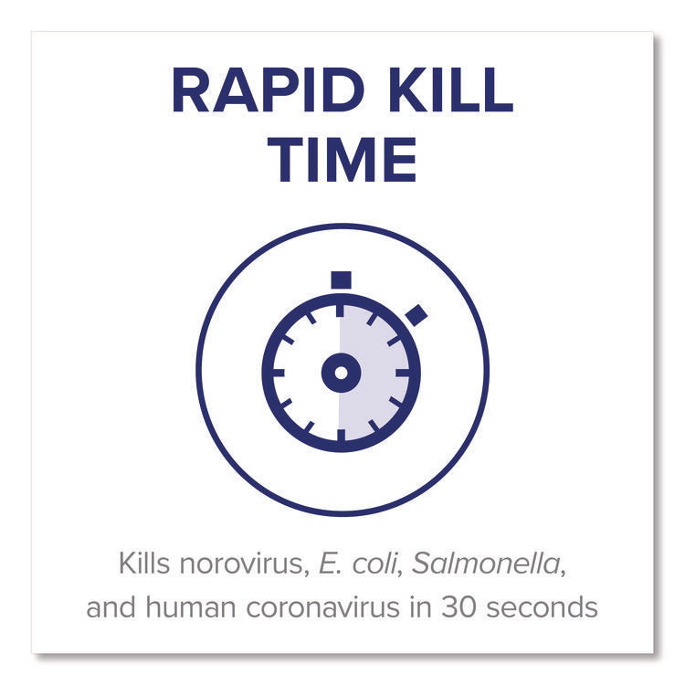 Formulated for convenience and ease-of-use, Foodservice Surface Sanitizer Spray provides powerful germ-kill on the surfaces people touch most yet is gentle enough to use on a child's highchair with no rinse required. Patented fragrance-free formulation sanitizes without any harsh chemicals. It eliminates 99.9 percent of viruses and bacteria on surfaces including norovirus, E. coli, Salmonella, and human coronavirus in 30 seconds. Application: Disinfectant/Cleaner; Applicable Material: Multi Surface; Chemical Compound: Ethyl Alcohol 29.4%; other ingredients 70.6%; Dirt Types: E.coli; Norovirus; Salmonella.