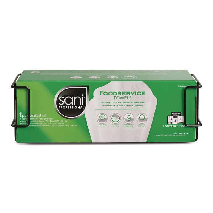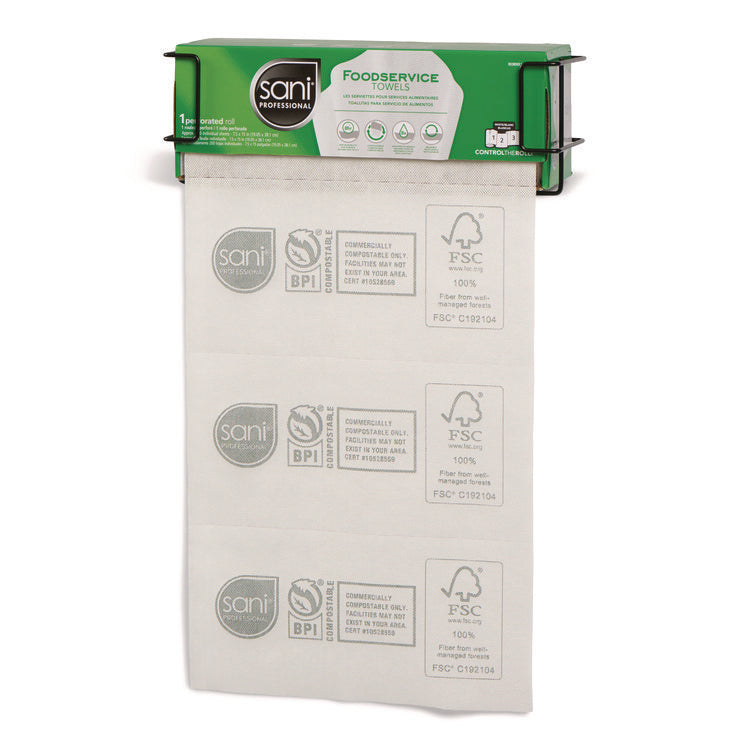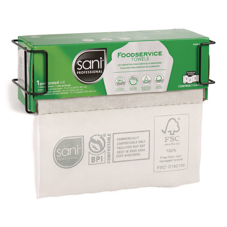 Dry Foodservice Towel bracket provides easy access to reusable Foodservice Towels any time and every time they're needed. It is the perfect accessory for a well-organized kitchen, or anywhere spills happen. Save counter and storage space by mounting your Foodservice Towels by the kitchen sink, the service sink, sanitizing stations, or near any surface that needs to be dried off frequently. The bracket lets you easily tear off the right sized sheet you need from the perforated roll. You won't need to go searching for a clean towel again when you can dispense them from our Foodservice Towel Bracket. Towels Dispensers Type: Roll Towel Dispenser; Material(s): Metal; Color(s): Black; Depth: 8".