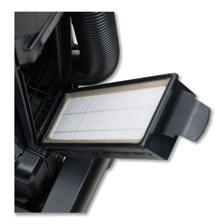 The FORCE™ QuietClean® upright with dirt cup and 15" cleaning path provides an exceptional clean certified with the CRI Bronze Seal of Approval. Lower your cost of ownership with a bagless dirt cup. Featuring a sealed HEPA system with included HEPA filter to capture 99.97% of particles for cleaner emissions. FORCE™ is LEED Qualified for daytime cleaning with a sound level of 69 dBA. Includes on-board tools and stretch hose for above-the-floor cleaning. Current: 10 A; Tank Capacity: 3.5 qt; Color(s): Black; Cleaning Path: 15".