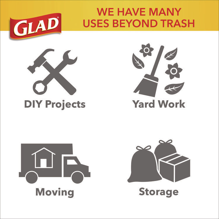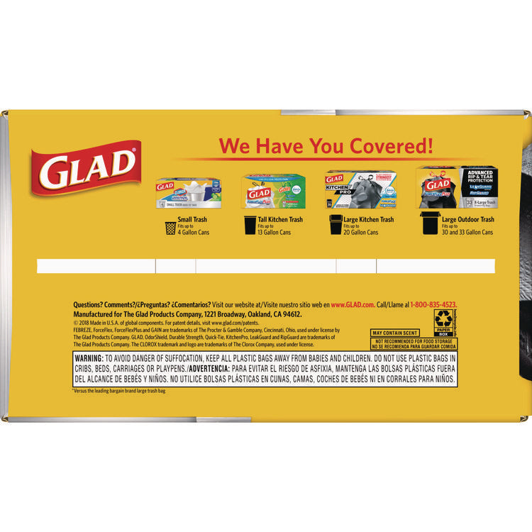 Glad® ForceFlexPlus™ Drawstring Bags are designed with Durable Strength™ and a reinforced side seam to let you carry the heaviest loads without tearing the bag. The large capacity bags fit a 30 gallon can and stretch around your trash with the ForceFlexPlus™ technology to prevent rips and tears. Built with advanced rip and tear protection, the LeakGuard™ Protection and RipGuard™ Protection can withstand even the toughest and messiest trash, so that what goes in, stays in. The strong reinforcing drawstring closure grips the can and ensures easy closing and lifting with one quick pull. These garbage bags are perfect for tough jobs throughout your home or office, indoor or outdoor. Ideal for use in restaurants, offices and other commercial facilities. Take out the trash with Glad® reliability and guaranteed stretchable strength. Commercial/Consumer Use: Consumer Use; Maximum Volume Range: 21 to 30 gal; Maximum Volume Capacity: 30 gal; Waste Bag Thickness: 1.05 mil.