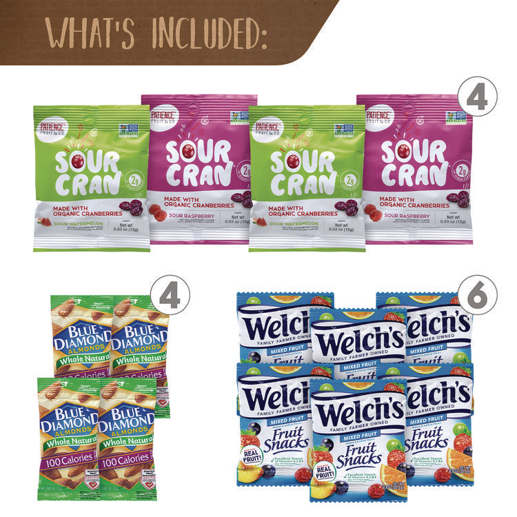 Fruits and Nuts Snack Box for all your nutty needs. Great for sharing with coworkers or just hiding in your desk for delicious snack bars anytime of the day, it's a great idea for the office or home! Products may vary by flavor per brand and substitutions may be made due to availability. Satisfy your sweet and savory cravings. Snacks are individually wrapped for sharing. Food Type: Snack Variety Packs; Flavor: Assorted; Capacity (Weight): 37 Assorted Snacks; Sugar Free: No.