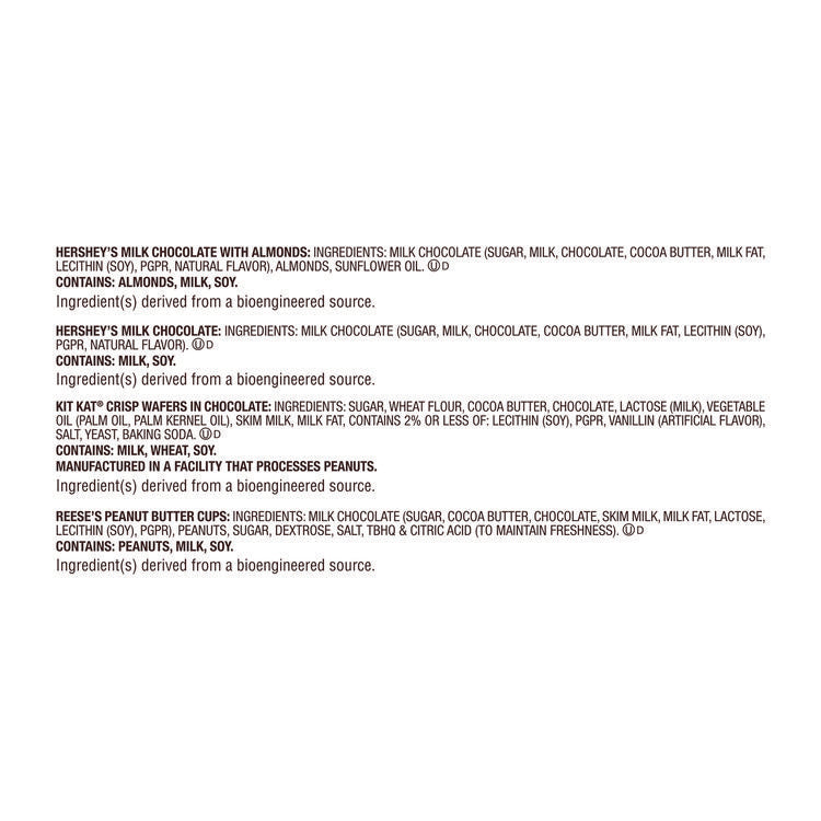 One box with something for everyone! This variety pack also makes a delicious gift! Food Type: Candy Bars; Flavor: Hershey®'s Milk Chocolate; Hershey®'s Milk Chocolate with Almonds; Kit Kat®; Reese's® Peanut Butter Cups; Capacity (Weight): 1.5 oz; Sugar Free: No.