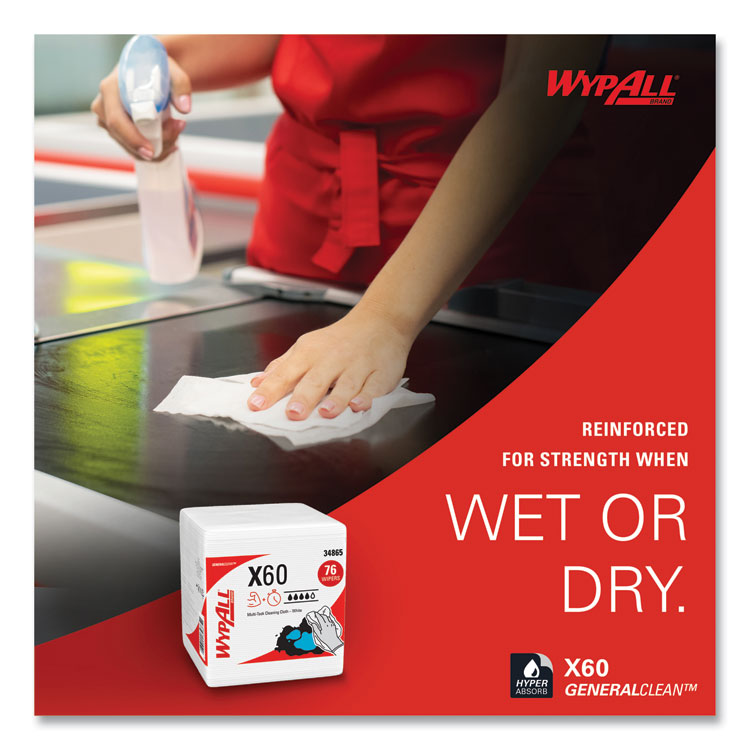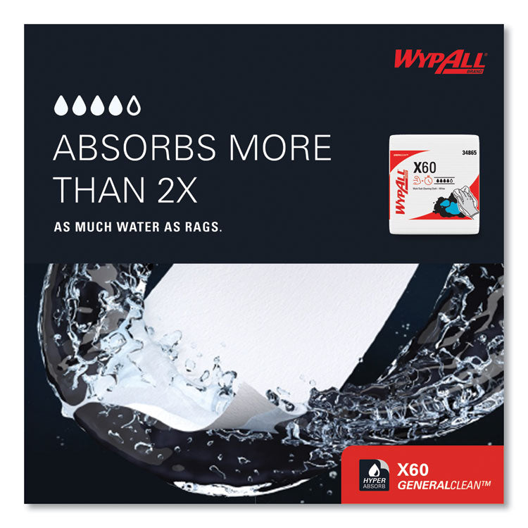 WypAll® General Clean X60 Cloths absorb more water than rags. They bring the absorbing power of HydroKnit technology (for superior absorbency) to a lighter-weight cloth. Designed to outperform laundered rags, the clothes help raise the standard for general-purpose cloths at a terrific value. They don't use adhesives or binders, so they'll leave no residue behind and they're reinforced for strength when wet or dry. These cleaning cloths are so sturdy that they can often be used more than once (once you've used them a few times, they're disposable). They're designed to reduce waste so you spend less. Quarterfold. Towel/Wipe Type: Dry Wipes; Application: General Purpose; Hand Washing; Material(s): Hydroknit; Number of Plies: 1.