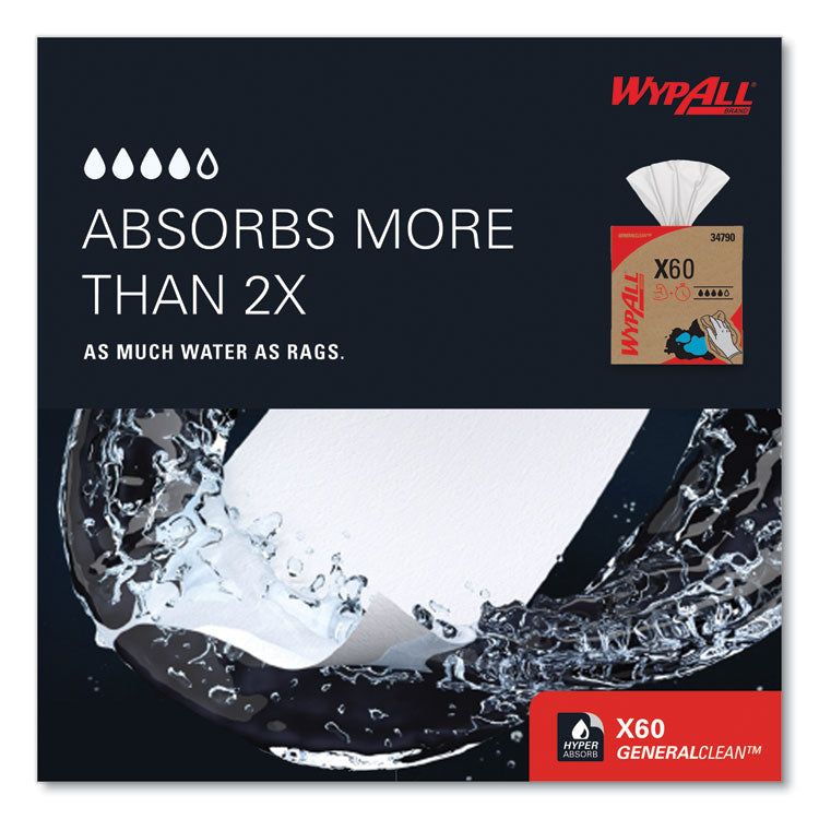 WypAll® General Clean X60 Cloths absorb more water than rags. They bring the absorbing power of HydroKnit technology (for superior absorbency) to a lighter-weight cloth. Designed to outperform laundered rags, the clothes help raise the standard for general-purpose cloths at a terrific value. They don't use adhesives or binders, so they'll leave no residue behind and they're reinforced for strength when wet or dry. These cleaning cloths are so sturdy that they can often be used more than once (once you've used them a few times, they're disposable). They're designed to reduce waste so you spend less. Pop-Up* Box. Towel/Wipe Type: Dry Wipes; Application: General Purpose; Hand Washing; Applicable Material: Metal; Plastic; Stainless Steel; Material(s): Hydroknit.