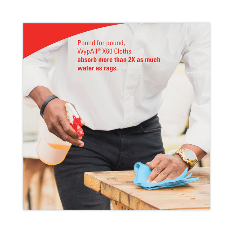 WypAll® General Clean X60 Cloths absorb more water than rags. They bring the absorbing power of HydroKnit technology (for superior absorbency) to a lighter-weight cloth. Designed to outperform laundered rags, the clothes help raise the standard for general-purpose cloths at a terrific value. They don't use adhesives or binders, so they'll leave no residue behind and they're reinforced for strength when wet or dry. These cleaning cloths are so sturdy that they can often be used more than once (once you've used them a few times, they're disposable). They're designed to reduce waste so you spend less. Small Roll. Application: General Purpose; Hand Washing; Material(s): Hydroknit; Color(s): Blue; Scent: Unscented.