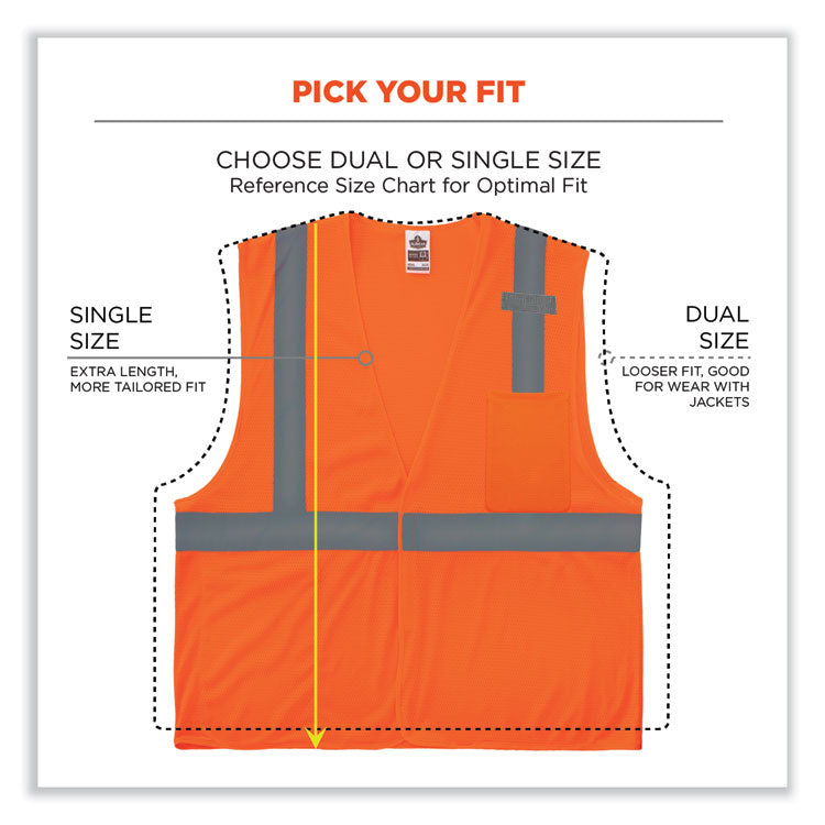 The GloWear 8210HL-S Mesh Hi-Vis Safety Vest is an ANSI 107 Type R, Class 2 vest made of 3.3 oz polyester mesh. This hi-vis vest features 2" reflective tape for enhanced low-light visibility, plus a lower interior pocket, exterior pocket and single mic tab. A hook and loop closure makes for easy on and off. This vest is available in single sizes to allow workers to order their exact size for a more tailored, performance-style fit compared to dual-size vests (tip: for best single-size fit, select one size down from your normal T-shirt size). This reflective safety vest is ideal for anyone requiring Type R, Class 2 apparel, including road construction, baggage handling and municipalities. Apparel Type: Safety Vest; Material(s): Polyester; Color(s): Orange; Color Family: Orange.