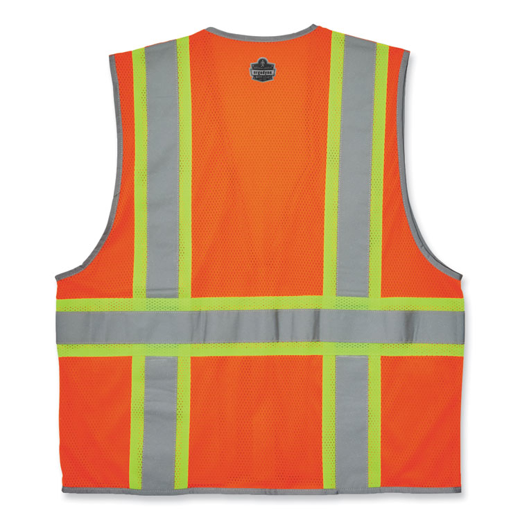 The GloWear 8246Z-S Mesh Two-Tone Hi-Vis Safety Vest is an ANSI 107 Type R, Class 2 vest made of 3.3oz polyester mesh. This hi-vis vest features 2" reflective tape set on a 3.5" contrasting mesh background and reflective piping for enhanced low-light visibility. Built for storage, this vest has two inside and four outside pockets, a clear ID badge holder and dual radio mic tabs. A zipper closure makes for easy on and off. This vest is available in single sizes to allow workers to order their exact size for a more tailored, performance-style fit compared to dual-size vests (tip: for best single-size fit, select one size down from your normal T-shirt size). This reflective safety vest is ideal for anyone requiring Type R, Class 2 apparel, including road construction, baggage handling and municipalities. Apparel Type: Safety Vest; Material(s): Polyester; Color(s): Orange; Color Family: Orange.